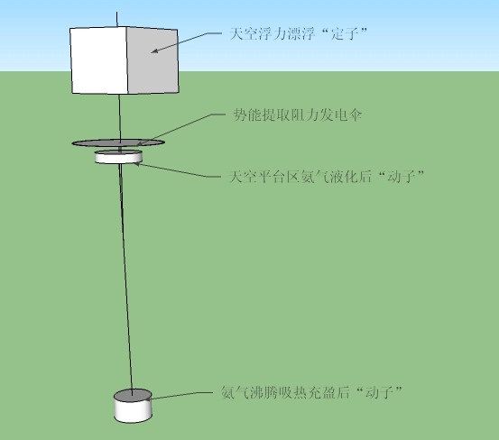 如上圖所示:設(shè)計(jì)一種系統(tǒng),在地面的時(shí)候“動(dòng)子”里面的物質(zhì)呈氣態(tài),而且單位體積明顯輕于空氣,就會(huì)形成比較大的浮力,使“動(dòng)子”具有上升的趨勢(shì),放開“動(dòng)子”任其在浮力下,自由上升,當(dāng)上升到一定高度后,“動(dòng)子”內(nèi)的氣體由于溫度明顯下降而液化成液體,這時(shí)浮力消失,“動(dòng)子”在重力作用下會(huì)快速下落。這就形成了一個(gè)利用熱能、勢(shì)能、動(dòng)能之間相互轉(zhuǎn)化而形成的一個(gè)“永動(dòng)系統(tǒng)”而且能從外界獲取可觀能源來(lái)發(fā)電。只要做出“動(dòng)子”上升時(shí)保溫,上升到一定高度后能自由撤銷保溫狀態(tài)進(jìn)行熱交換就可以了。