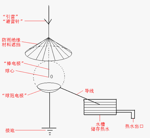 如圖7,可以在“雷擊村”,或其他發(fā)生“閃電”較多的區(qū)域,并且遠(yuǎn)離居民區(qū)的地方,放置一些大大小小的“棒電極——球冠電極”。“棒電極”樹立于空中,用于招引閃電,類似于“避雷針”,但必須與其接地的支撐物絕緣,并且深入到“球冠電極”球心的頂端部位,越細(xì)越好——越細(xì)激發(fā)的“球狀閃電”的能量越大。“球冠電極”的頂端接地,在其邊沿接一導(dǎo)線引入水槽,在閃電放電時,產(chǎn)生的“球狀閃電”可以沿導(dǎo)線進入水槽,“球狀閃電”所含的部分能量——熱能可以加熱水,這樣“閃電”的能量,就可以通過“接轉(zhuǎn)”為“球狀閃電”,再把可以“暫時儲存能量”的“球狀閃電”的部分能量——熱能傳給水,人們就可以利用熱水用于工業(yè)生產(chǎn)或日常生活了。