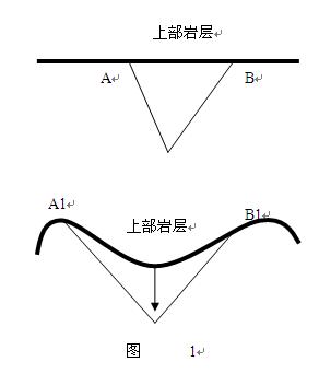 冰輒理論認(rèn)為:地殼運動與巖漿無關(guān),它是地殼自身結(jié)構(gòu)關(guān)系的進(jìn)一步調(diào)整,是地殼自身重力作用的結(jié)果。至于山脈的形成,我認(rèn)為同樣與地下斷裂密切相關(guān),地下斷裂是地質(zhì)活動的結(jié)果,地下斷裂的的擴(kuò)大與發(fā)展更是地質(zhì)活動的基本運動形式。隨著地下斷裂的擴(kuò)大與發(fā)展,底層斷裂區(qū)域承壓能力逐漸降低,上部巖層也因地下斷裂的擴(kuò)大,最終發(fā)生自身重力作用下的區(qū)域性沉降。如圖1所示AB、A1B1為斷裂上部的巖層,初始階段斷裂較小上部巖層AB無彎曲,隨著時間的推移斷裂逐漸增大斷裂上部巖層在重力作用下逐漸發(fā)生彎曲(如A1B1所示),這時,區(qū)域性沉降的上部巖層的兩端A1、B1處相對隆起,產(chǎn)生褶皺,這就形成了山脈。