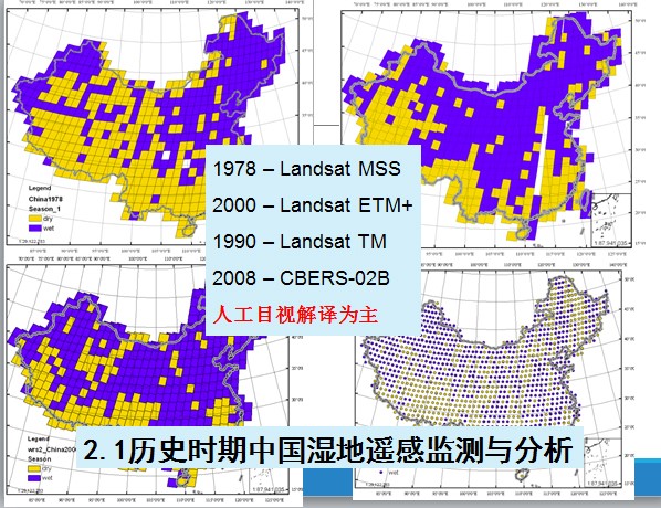 歷史時期中國濕地監測與變化分析,因為濕地復雜性太難了,但是當時已經具備了所有遙感數據,70年代的MSS,能全部覆蓋一次衛星數據的,這是1978年MSS數據,到了2000年,1990年,到了2008年我們用中巴衛星數據做了研究,每期我們都出了大量的數據,我們只想了解一下我們國家的濕地情況,就用最笨的方法人工目視解譯,做了大概3年時間,前后投入60、70個人做完這項工作,基本上對咱們國家濕地現狀有一個初步的了解。