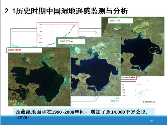 如圖所示,我們用了GLAS數據,測試高層數據反應了水面高層,反應湖水容納變化。這是青藏高原的輪廓,冰川融水非常的多,原來納木錯是最大的,現在色林錯最大,20年前西藏濕地增加1萬多平方公里。