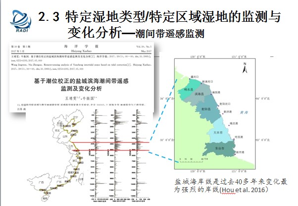 特定濕地類型的監測與變化分析,為什么最近在做特定類型呢?我們發現監測濕地變化呢,從無到有,從原來不了解,研究了之后發現我們很多數據不足,包括其中很多類型沒有監測到,包括水田用其他的方法補充進去了。因為海洋漲潮的時候衛星每天時間大概早上5點過境,但是沒法監測潮間帶,所以我們對潮間帶做了監測。