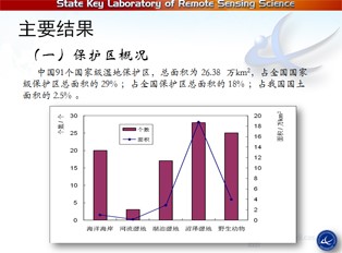 這是保護區的效果,在我結論里面按個數來看保護好的19個,保護不太好是44個,所占比例不太好將近一半,但是從面積來看非常不樂觀79%不太好,原因在什么地方呢?后面我們也分析了,有一個全國最大的保護區,一個保護區占超過15萬平方公里,主要是這一個保護區造成比例相差大一點。