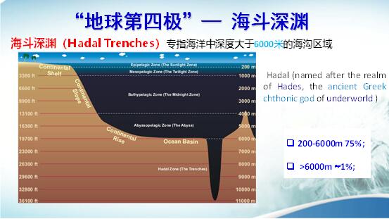 1956年,一位瑞士科學家把大于6000米深度的海域叫海底深淵。這位科學家是海洋生物學家,他發現,6000米上下的海洋生物,屬于不同的生態系統。在6000米以下的生物的吸收、生態、演化,與6000米以上的生物完全不同,而且,6000米以下的生物始終在6000米以下的海水中生活。同時發現,6000米以上的生物也不會到下面去。