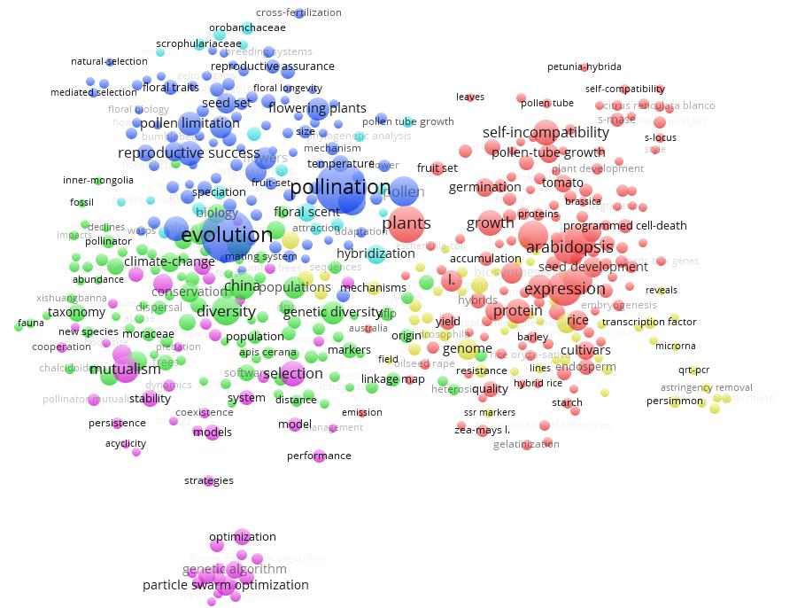 利用Vos Viewer軟件分析2013-2017年中國(guó)傳粉生物學(xué)領(lǐng)域的SCI論文,獲得中國(guó)傳粉生物學(xué)領(lǐng)域的研究熱點(diǎn)是:1)植物花粉管生長(zhǎng)、發(fā)育等分子、細(xì)胞層面基礎(chǔ)機(jī)制研究;2)傳粉昆蟲(chóng)的分類學(xué)研究,及其遺傳多樣性、保護(hù)、種群擴(kuò)散等方面的研究;3)昆蟲(chóng)傳粉在植物遺傳育種、進(jìn)化中發(fā)揮重要作用;4)與傳粉相關(guān)的植物轉(zhuǎn)錄因子、microRNA、殺蟲(chóng)劑耐藥性等方面的研究;5)傳粉昆蟲(chóng)的種群優(yōu)化、傳粉昆蟲(chóng)互作等方面的研究。